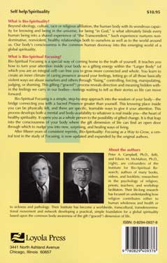 The process of BioSpiritual Focusing directly addresses this profound contemporary problem. Through his research, Dr. Gendlin has identified the psychological mechanism that locks addictive patterns in place and makes them so resistant to change, whether within an individual, a culture, or a social group such as organized religion. Gendlin calls this mechanism a process-skipping structure We describe it in a new appendix that has been added to this version of BioSpirituality . Within this same appendix we outline five easily understood criteria to help our readers evaluate the health or potential process- skipping pathology in spiritual and growth practices. BioSpiritual Focusing offers a healthy path to wholeness by providing access to a gifting wisdom within our own body.